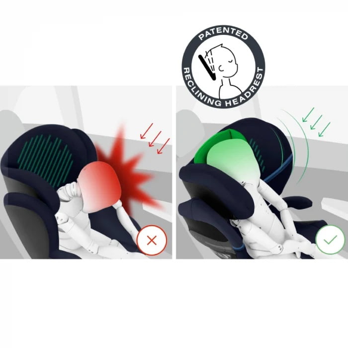 Mecanismul patentat de inclinare al tetierei in 3 pozitii previne caderea in fata a capului copilului in timpul somnului. Aceasta caracteristica asigura mentinerea capului in zona de siguranta oferita de tetiera. Acest lucru este important mai ales in cazul unui impact lateral. Inclinarea scaunului cu o singura mana va ajuta sa gasiti cea mai buna pozitie pentru un somn linistitor.